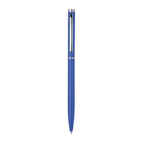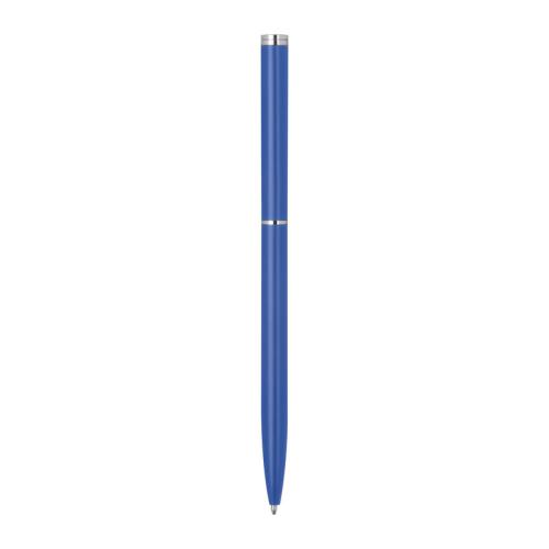 Elegant metal ball pen in a slim shape with chromed clip and blue-writing refill.