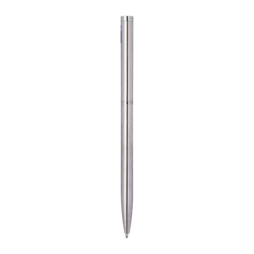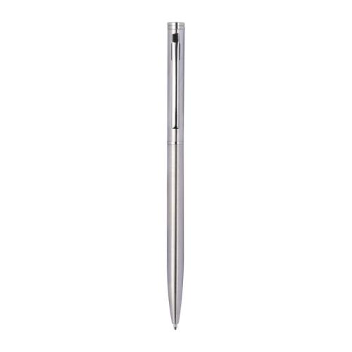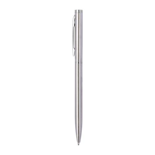 Elegant metal ball pen in a slim shape with chromed clip and blue-writing refill.