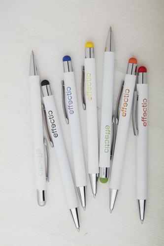 Aluminium ballpoint and touch screen pen with blue refill. With special coating for mirror engraving matching the stylus colour.
