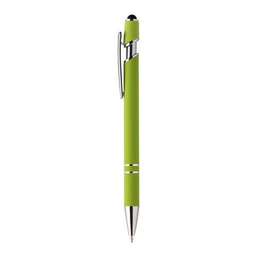 Recycled aluminium ballpoint and touchscreen pen with rubberized body and chrome details. With blue refill.