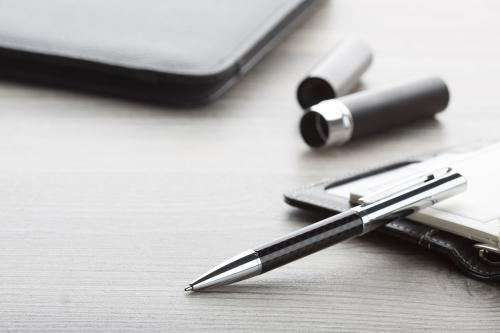 Metal ballpoint pen with carbon designed barrel and with blue refill.