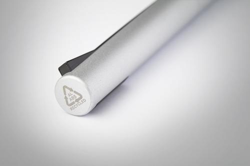 Recycled aluminium ballpoint pen in matte metallic colour, with recycled ABS upper barrel and special clip movement. With blue refill.