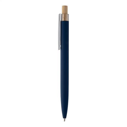 Recycled aluminium ballpoint pen with rubberized finish, bamboo button and chrome clip. With special coating for mirror laser engraving. With blue refill.