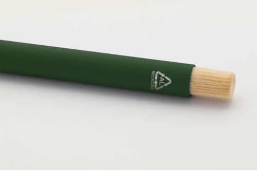 Recycled aluminium ballpoint pen with rubberized finish and bamboo button and chrome details. With special coating for mirror laser engraving. With blue refill.