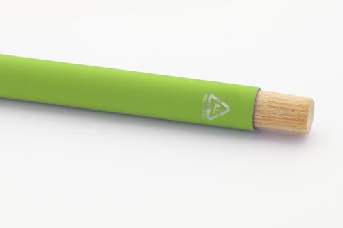Recycled aluminium ballpoint pen with rubberized finish and bamboo button and chrome details. With special coating for mirror laser engraving. With blue refill.