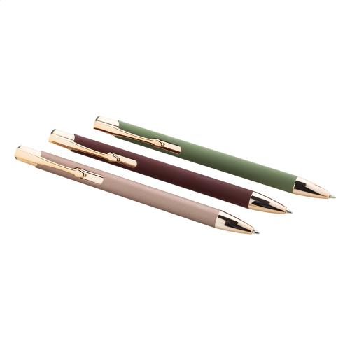 Recycled aluminium ballpoint pen with rubberized finish and rose gold details. With special coating for mirror laser engraving in rose gold colour. With blue refill.