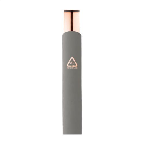 Recycled aluminium ballpoint pen with rubberized finish and rose gold details. With special coating for mirror laser engraving in rose gold colour. With blue refill.