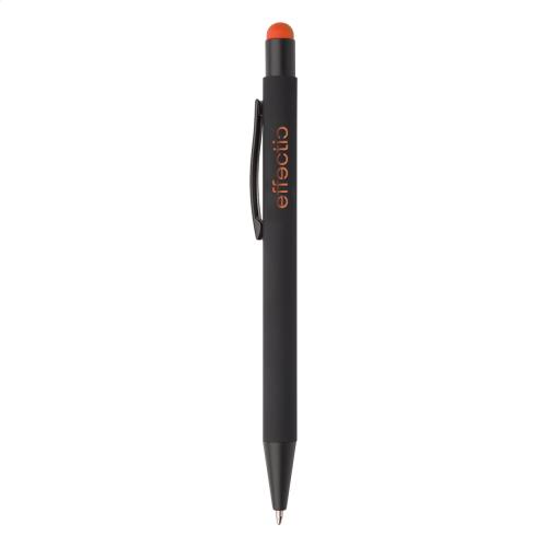 Aluminium ballpoint and touch screen pen with rubberized finish. With special coating for mirror engraving matching the stylus colour. With blue refill.