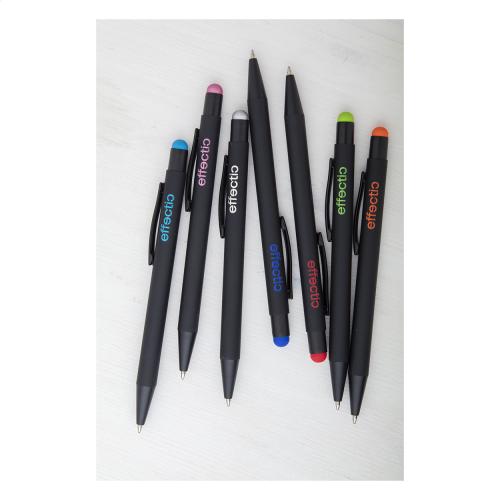 Aluminium ballpoint and touch screen pen with rubberized finish. With special coating for mirror engraving matching the stylus colour. With blue refill.
