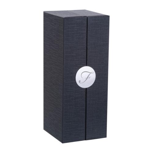 Blue-writing Ferraghini rollerball pen made of stainless steel, featuring the distinctive “F” on the clip top and a writing length of up to 400 m. Packaged in a high-quality box matching the pen.