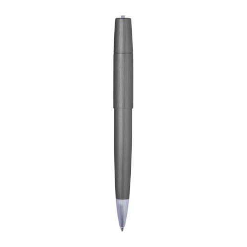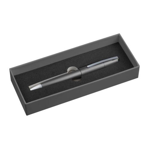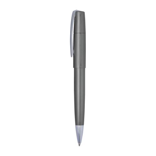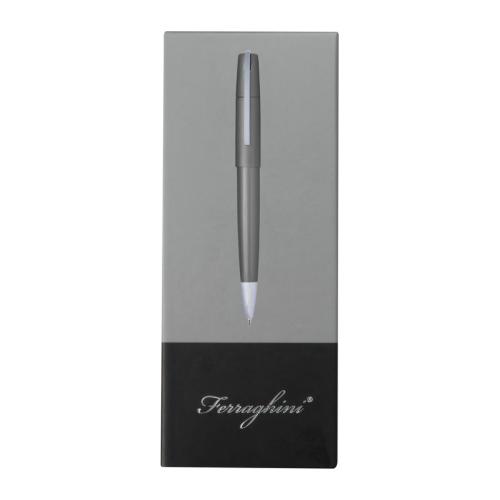 Elegant twist action ball pen from the Ferraghini brand made of metal with silver applications and a large capacity refill that writes in blue.
