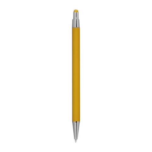 Slim metal pen with rubberized coating, blue-writing refill, and touch function.