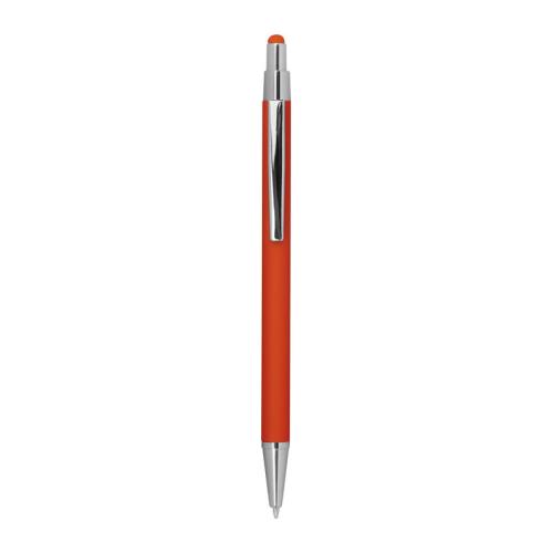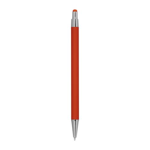 Slim metal pen with rubberized coating, blue-writing refill, and touch function.