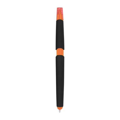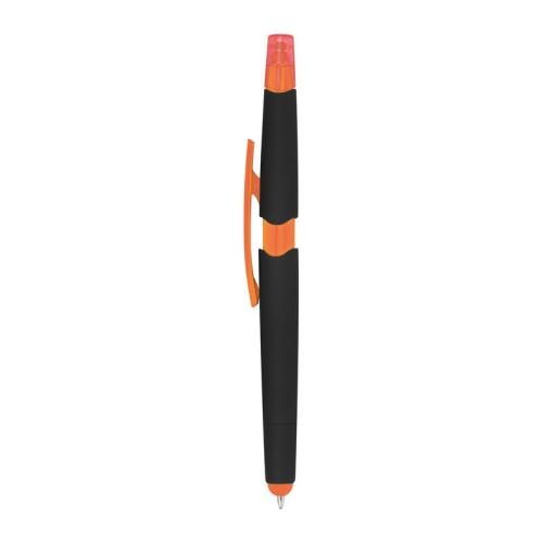 Plastic ballpoint pen with highlighter, rubberized sheath, blue-writing refill, and touch function.