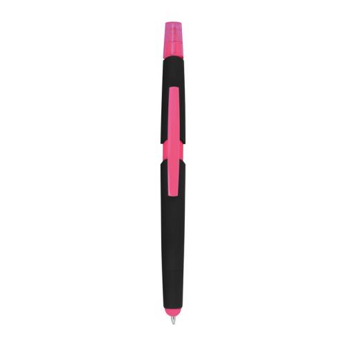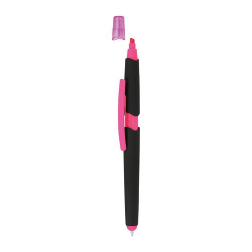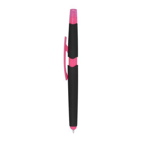Plastic ballpoint pen with highlighter, rubberized sheath, blue-writing refill, and touch function.