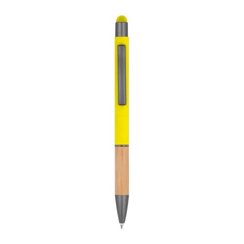 Ball pen made of aluminium with blue-writing refill, touch function, matte silver applications and a bamboo grip zone.