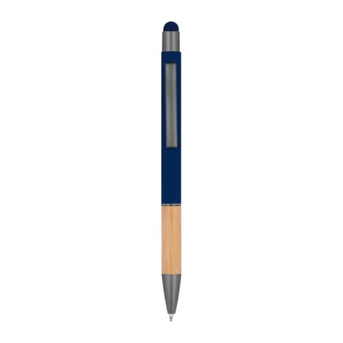 Ball pen made of aluminium with blue-writing refill, touch function, matte silver applications and a bamboo grip zone.