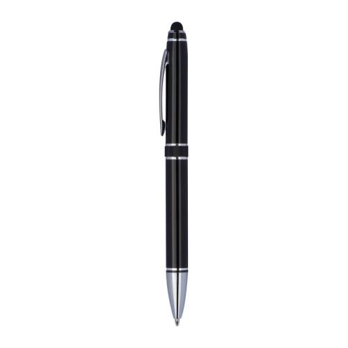 High-quality aluminium twist ball pen with blue-writing refill, silver applications and touch function in an eco-friendly case.