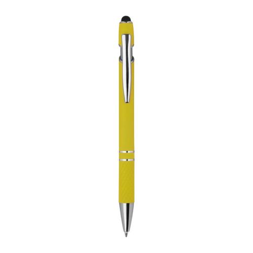 Aluminium balll pen with silver applications, blue-writing big refill, touch function and patterned grip zone.