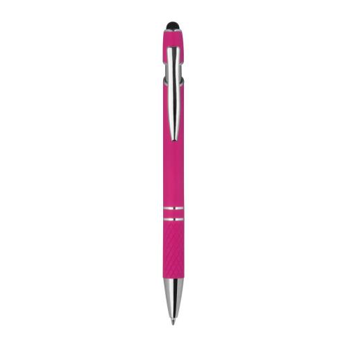 Aluminium balll pen with silver applications, blue-writing big refill, touch function and patterned grip zone.