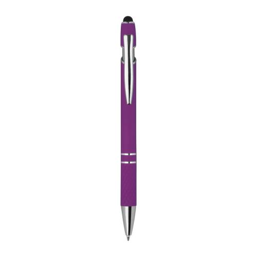 Aluminium balll pen with silver applications, blue-writing big refill, touch function and patterned grip zone.