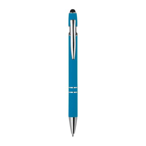 Aluminium balll pen with silver applications, blue-writing big refill, touch function and patterned grip zone.