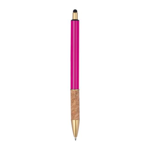 Metal ball pen with golden applications, blue-writing refill and cork grip zone.
