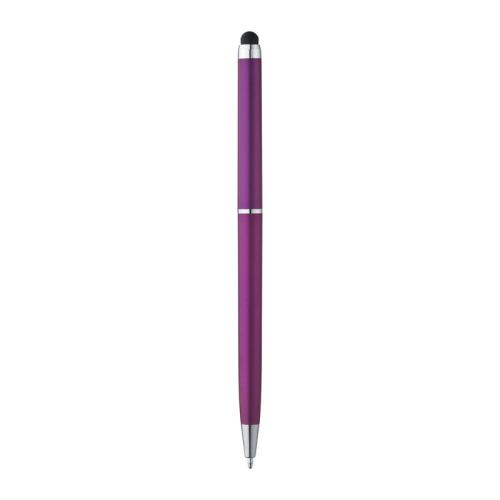 Rotary ball pen made of plastic in elegant slim shape, with blue-writing refill and practical touch pad for effortless handling of smartphones and tablet PCs.