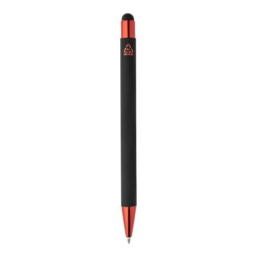 Recycled aluminium ballpoint and touch screen pen with black rubberized body and coloured shiny metallic finish parts. With special coating for mirror engraving matching the metallic parts. With blue refill.