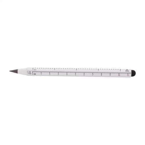 Recycled aluminium long-lasting inkless pen with touch stylus and metal alloy tip, which oxidizes the paper. With hexagonal barrel including 11 cm and 4 inch rulers. This pen writes similarly to a pencil, and it is also erasable.