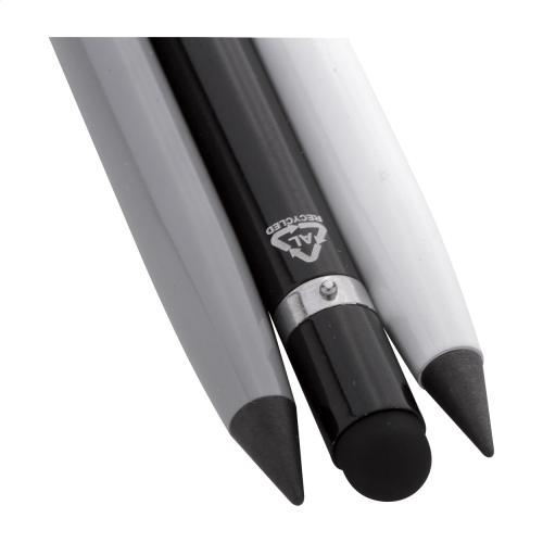Recycled aluminium, long-lasting inkless pen with touch screen stylus and metal alloy tip, which oxidizes the paper. This pen writes similarly to a pencil and it is also erasable. Including eraser on the inside of the touch stylus.