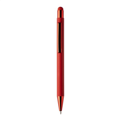 Recycled aluminium ballpoint and touch screen pen with rubberized body and coloured shiny metallic finish parts. With special coating for mirror engraving matching the metallic parts. With blue refill.