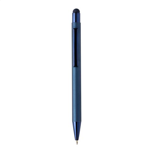 Recycled aluminium ballpoint and touch screen pen with rubberized body and coloured shiny metallic finish parts. With special coating for mirror engraving matching the metallic parts. With blue refill.