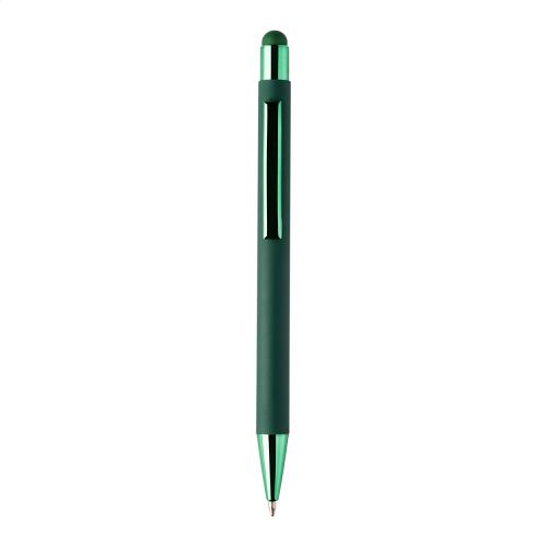Recycled aluminium ballpoint and touch screen pen with rubberized body and coloured shiny metallic finish parts. With special coating for mirror engraving matching the metallic parts. With blue refill.