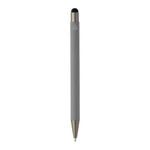 Recycled aluminium ballpoint and touch screen pen with rubberized body and gunmetal finish parts. With blue refill.