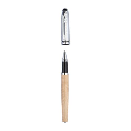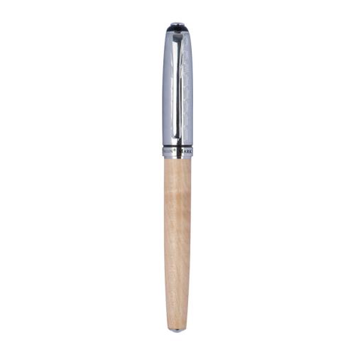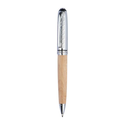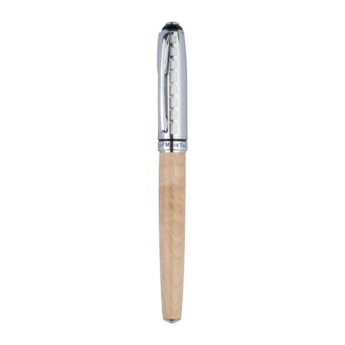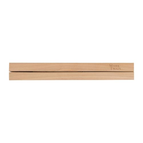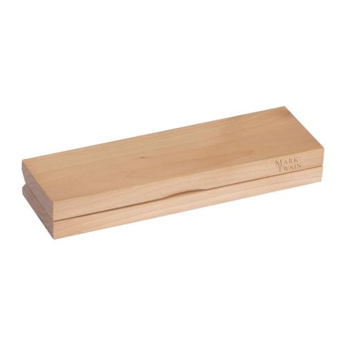 High-quality Mark Twain writing set consisting of a blue twist ballpoint pen with a large refill and a metal rollerball with a wooden body. The set is packed in a natural wooden box.