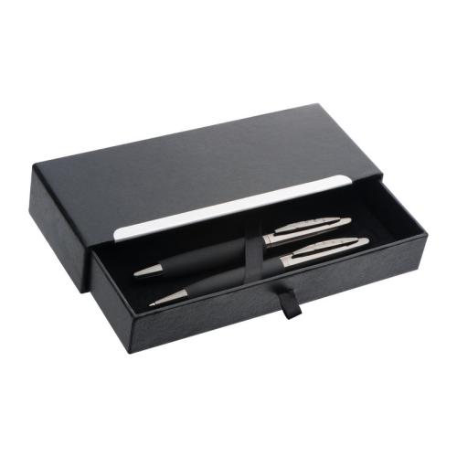Mark Twain writing set in a black case, consisting of a blue-writing ballpen with twist mechanism and a fountain pen with rubberized shaft.
