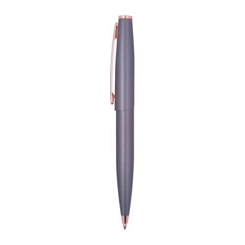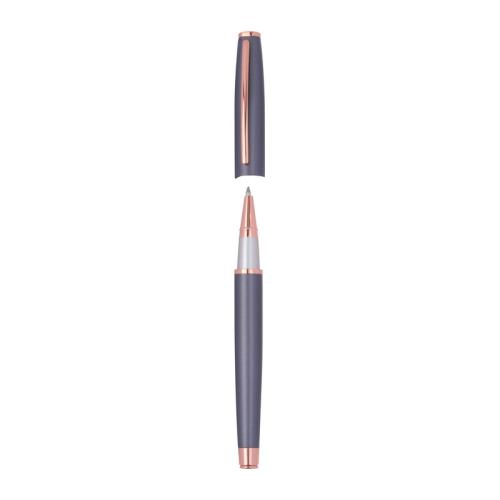 CrisMa metal writing set consisting of a twist ballpoint pen (800 m writing length) and a rollerball pen (500 m writing length) made of metal with rosegold-colored details. Both pens write in blue and come packaged in a black cardboard box.