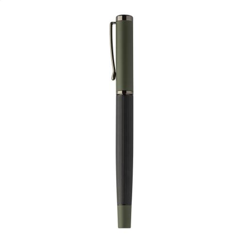 Elegant, metal ballpoint pen and roller pen set with striped barrels, coloured accents and shiny gunmetal details. In matching colour gift box, with blue refill. André Philippe brand product.