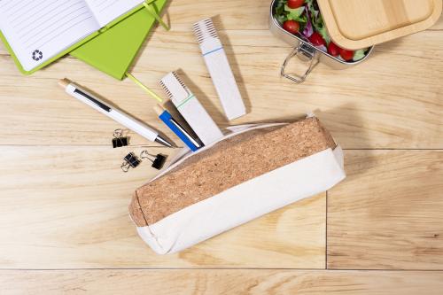 Zipped natural cork and cotton pen case with matching cotton zipper pull.