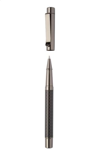 Elegant, metal ballpoint pen and roller pen set, with carbon patterned barrel and gunmetal finish parts. In carbon patterned gift box, with blue refill.