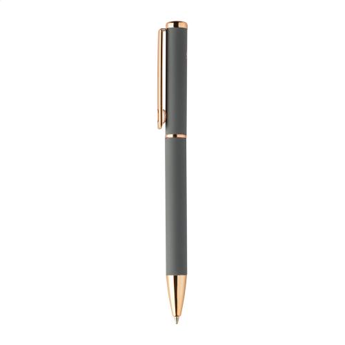 Recycled aluminium pen set with ballpoint pen and roller pen with rubberized finish and rose gold details. With blue refill. With special coating for mirror laser engraving in rose gold colour. In black paper gift box.