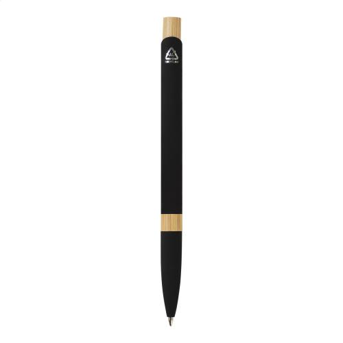 2 piece gift set in kraft paper gift box. Including recycled aluminium ballpoint pen with bamboo details, rubberized finish and blue refill, and bamboo keyring with rubberized finish recycled stainless steel plate. Both items feature special coating for mirror laser engraving.