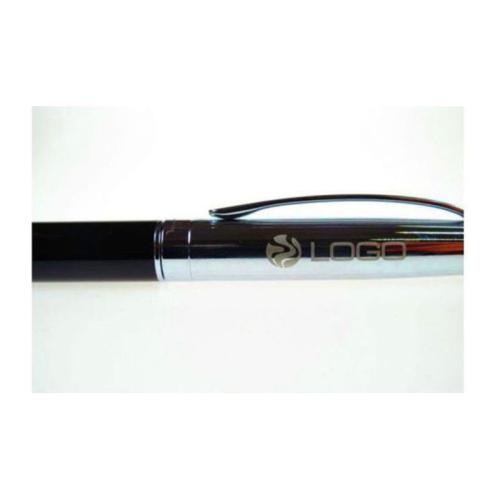 Branded metal rollerball Pierre Cardin. The bottom part is made in black colour, upper silver part is decorated by fine engraving on the surface. Rollerball nib is protected by silver cap.
