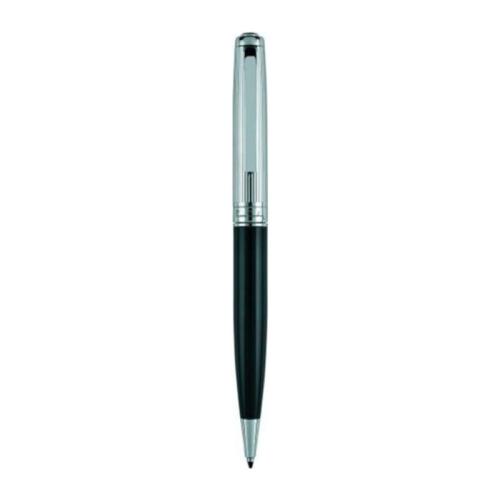 Branded metal rollerball and ballpoint pen Pierre Cardin. The bottom part is made in black colour, upper silver part is decorated by fine engraving on the surface.