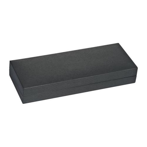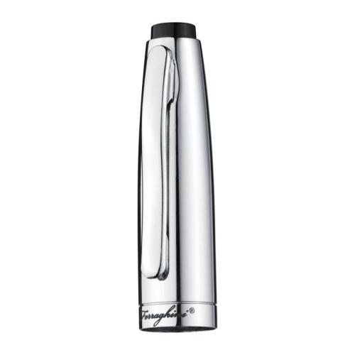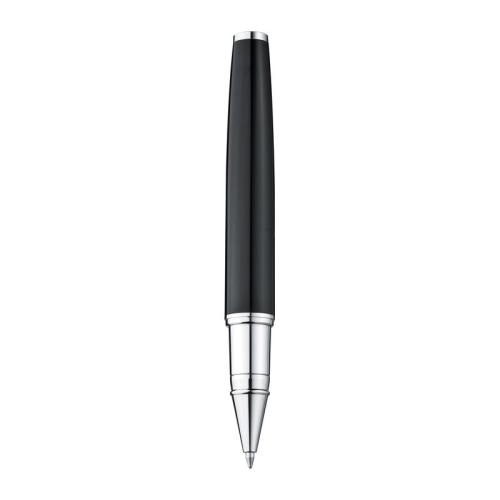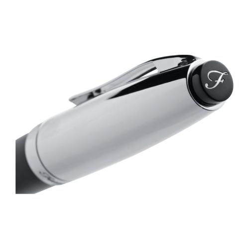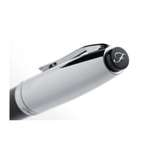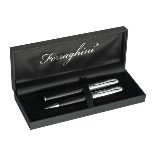 Classically elegant Ferraghini writing set consisting of a ball pen with twist mechanism and a rollerball pen (both blue-writing) in a black folding box.