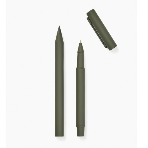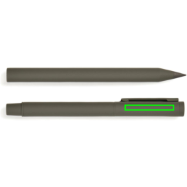 This modern and sleek set includes two pens: an eternal pen and a classic ballpoint pen with a cap and clip. Designed for both style and functionality, these pens are crafted from RCS certified recycled stainless steel, featuring a rubber surface coating for a comfortable grip and a matt finish. Both pens have a balanced weight that ensures stability and effortless writing. The eternal pen offers limitless writing. The ballpoint pen features a fine 1.00 mm tip and provides smooth, consistent writing with documental blue ink, lasting up to 1200 metres. Certified by RCS (Recycled Claim Standard), RCS certification guarantees that the entire supply chain of recycled materials is certified. The total recycled content is based on the overall product weight. This product contains 52% RCS certified recycled aluminum and 10% RCS certified stainless steel.