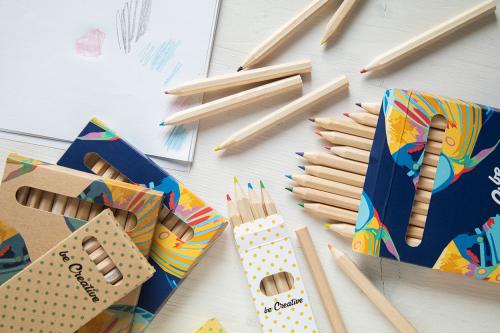 Wooden coloured pencils (4 pcs) in full colour printed kraft paper box. Price includes digital printing. MOQ: 100 pcs.