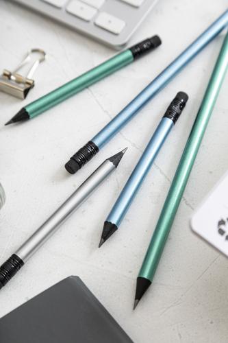 Black wood lead pencil in metallic finish, with black eraser. Sharpened, HB grade.