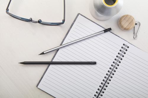 Black wood lead pencil in metallic finish, with black eraser. Sharpened, HB grade.